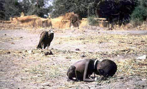 一個非洲小孩因疾病和飢餓使得命在旦夕時,旁邊即刻就有一隻禿鷲虎視眈眈盯著小孩,