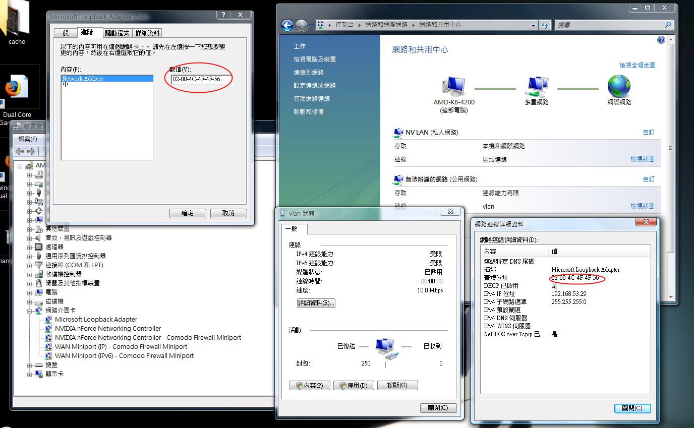 更改 Microsoft Loopback Adapter MAC 方法如下圖: