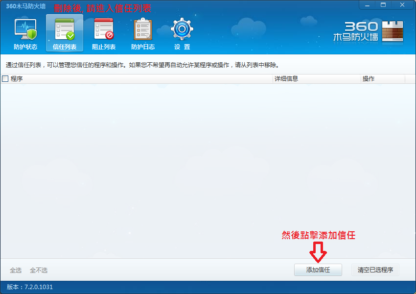 完成刪除後, 請到信任列表, 然後將鼠標移到右下方的添加信任按鈕, 並且點擊進入.