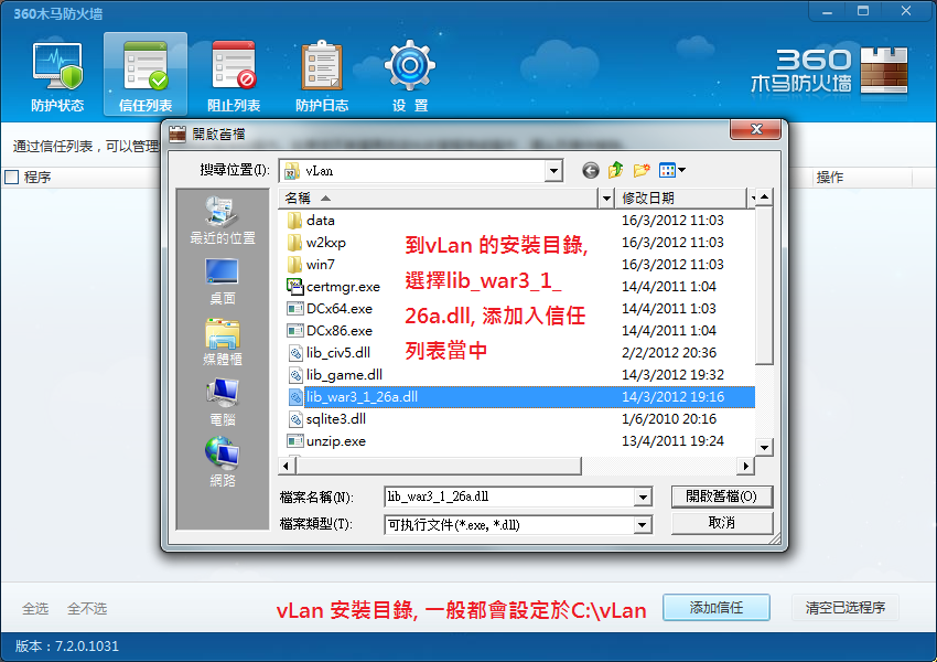 到vLan 的安裝目錄, 請選擇lib_war3_1_26a.dll, 然後添加入信任列表當中. (一般情況下, vLan 的安裝目錄都會設定於C:\vLan)
