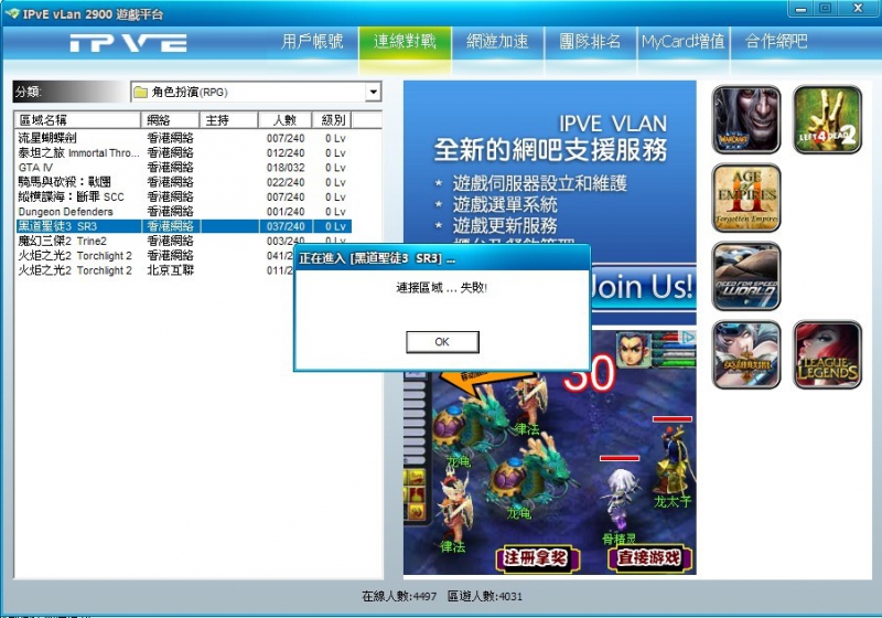 在家里连可以进入区域、今天来网吧就弹出连接区域失败、不管进入任何一个游戏区域都是显示连接区域失败。上个图。