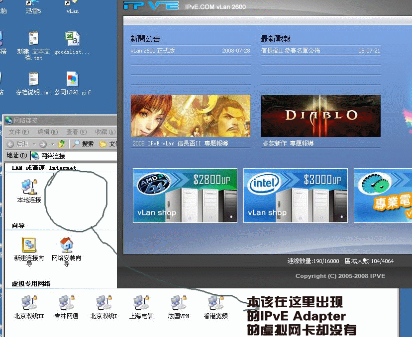 求救!安装Vlan2006,整个过程没有任何提升,一路全过,和正确安装一样,但是我却一直服务联机,后来发现,正常安装Vlan2006后,却不显示已经安装了IPvE Adapter的虚拟网卡 !