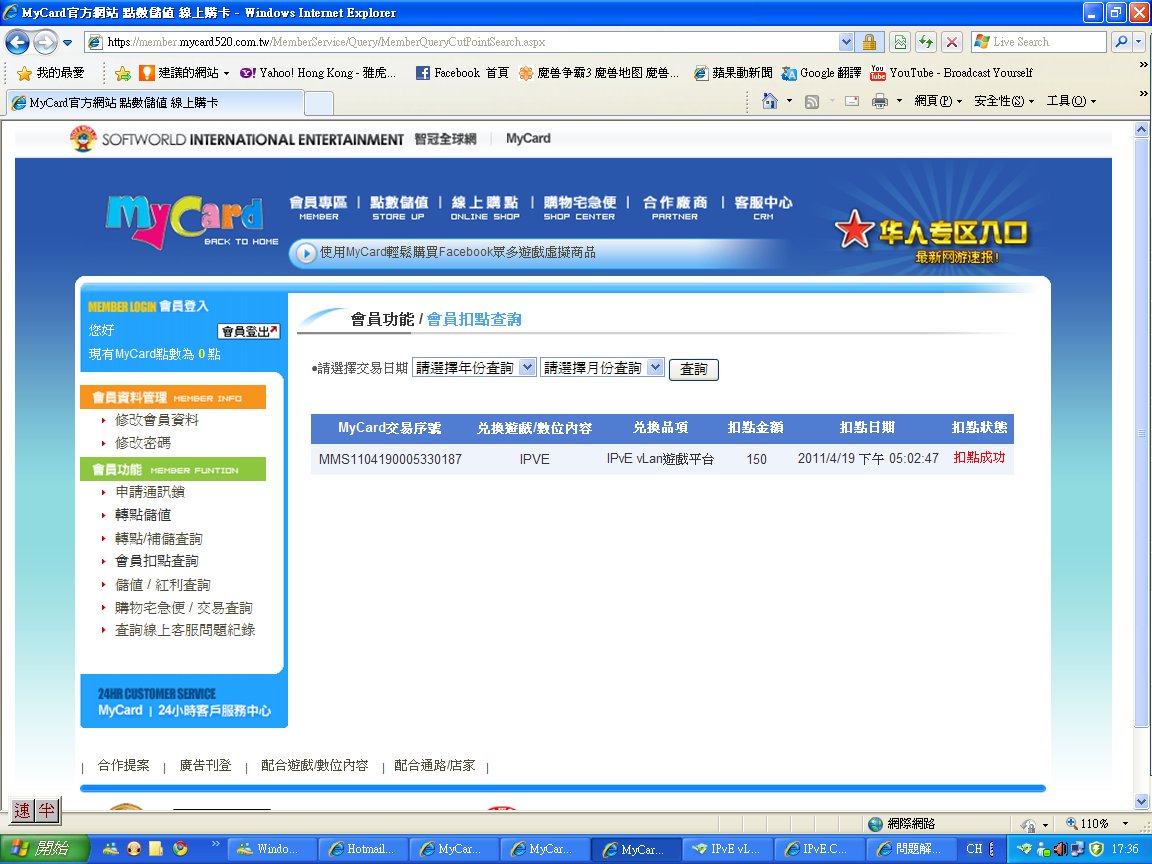 系統記錄并沒有 MMS1104190005330187 的記錄,我們會立即與 MyCard 聯系,請耐心等候。