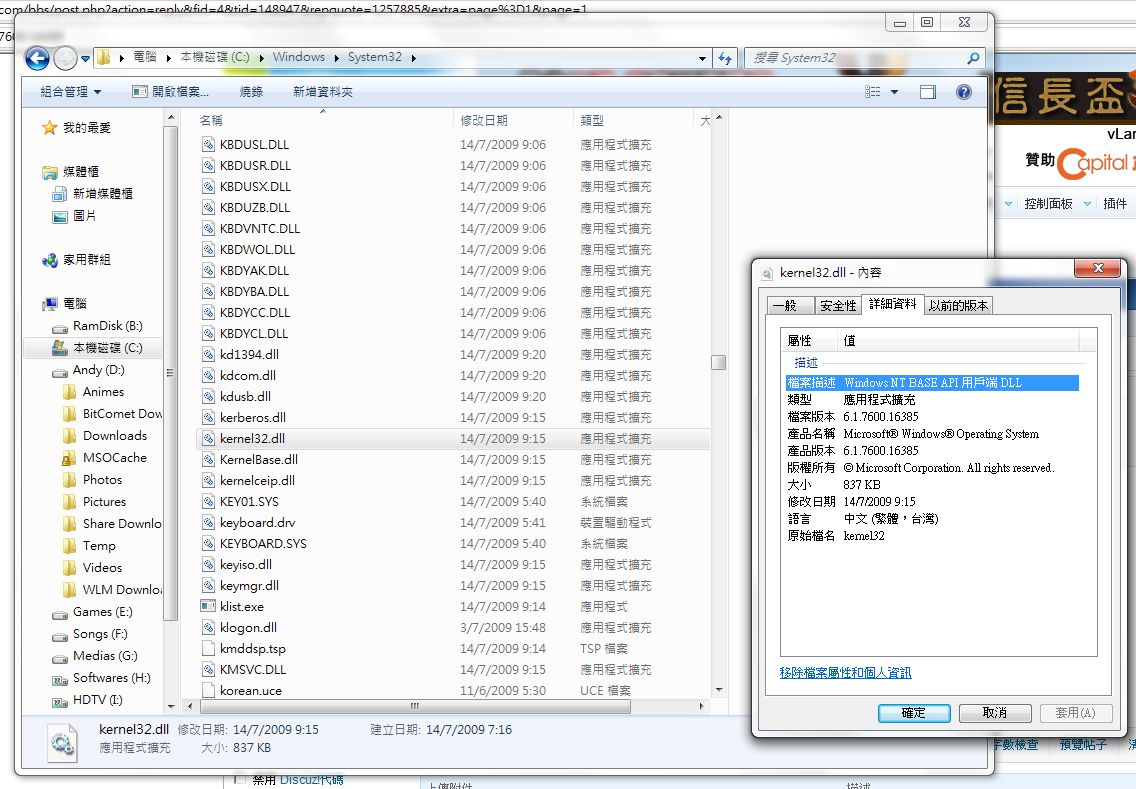 原帖由 alan_wong8 於 2009-8-29 01:27 發表 會唔會係你既WINDOW 7 出現問題? 你試下去C:\WINDOWS\system32 搵一個file 叫kernel32.dll 另外, 會著手重新測試WINDOW 7