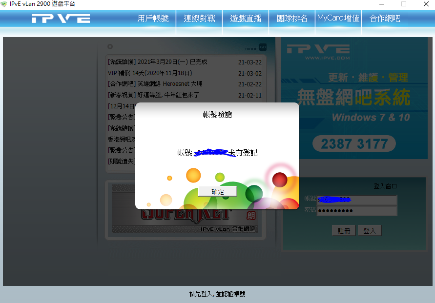登入IPvE vLan 2900遊戲平台還是一樣的狀況出現帳號未有登記