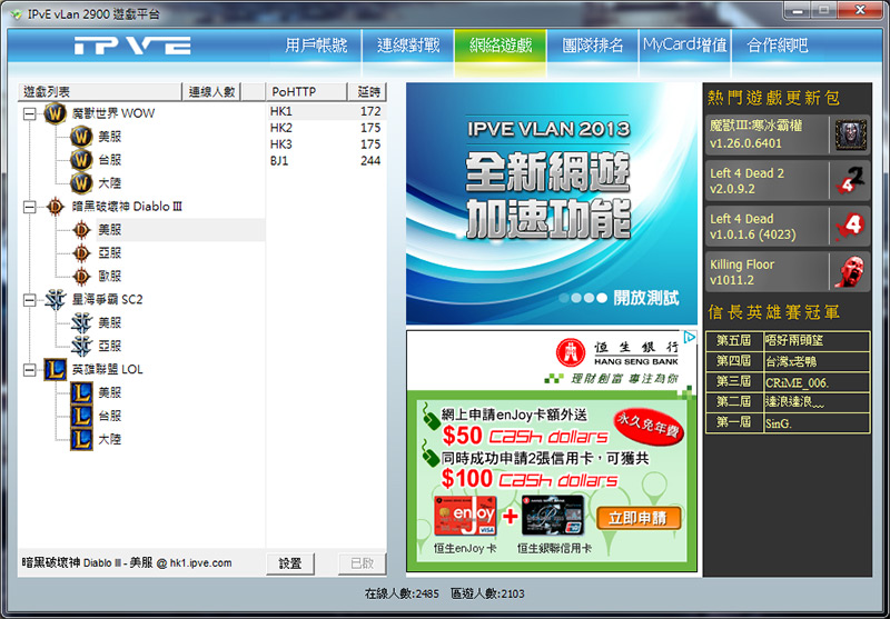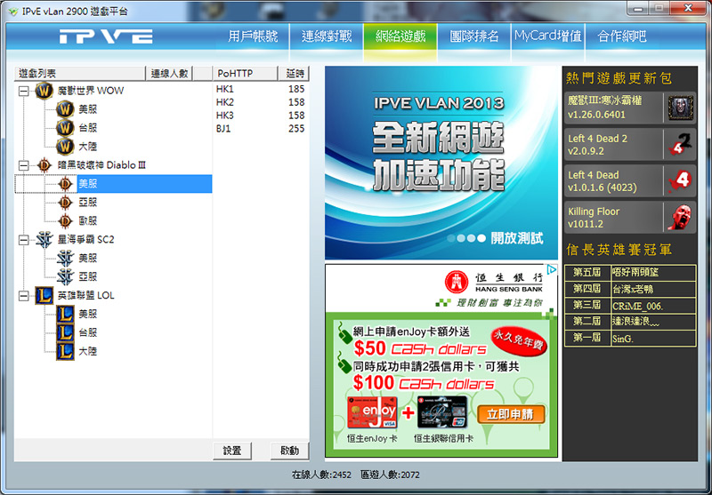 1. 登入vLan 遊戲平台後於上方選擇網絡遊戲,將會出現遊戲列表,而右方出現PoHTTP HK1,HK2,HK3,及BJ1此地方將會顯示玩家到我們vLan 遊戲線路即時網絡延遲狀態。