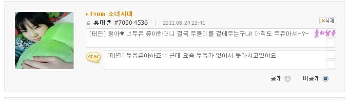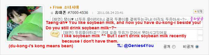 [泰妍] 我喜歡豆奶^^,但最近沒得喝了,因為沒有~