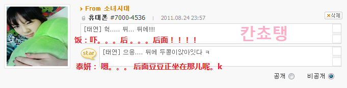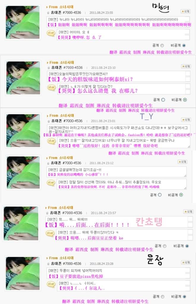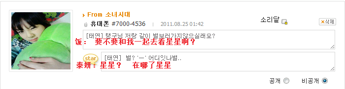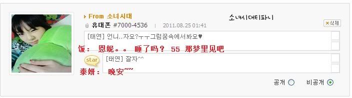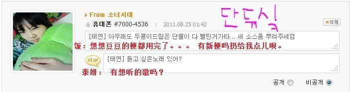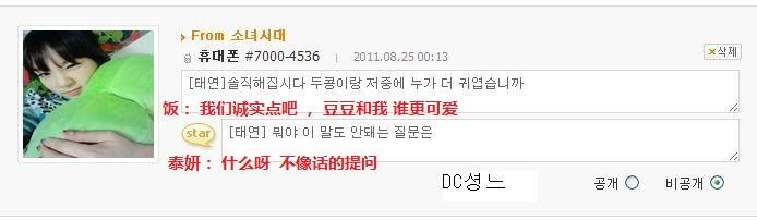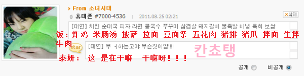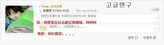 [飯]泰妍啊~最近幹什麼呢 別的成員都是 這個 採訪會啊那個服裝秀啊 什麼的 呵呵是因為想你所以問的過的還好吧